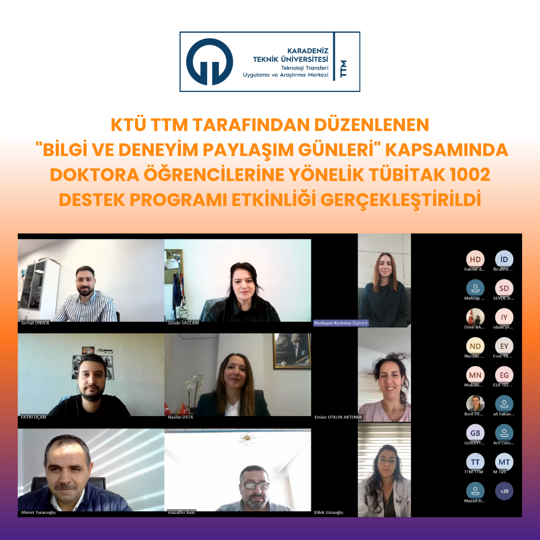 Karadeniz Teknik Üniversitesi Teknoloji Transferi Uygulama ve Araştırma Merkezi (KTÜ TTM) tarafından düzenlenen Bilgi ve Deneyim Paylaşım Günleri etkinlik serisi, “Doktora Öğrencilerine Yönelik TÜBİTAK 1002 Destek Programı” başlıklı oturumla devam etti.