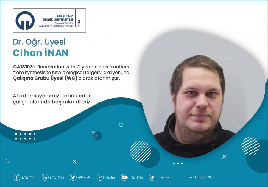 Üniversitemiz Fen Fakültesi Moleküler Biyoloji ve Genetik Bölümü öğretim üyesi Dr. Öğr. Üyesi Cihan İNAN, COST Programı’nın “CA18103 - Innovation with Glycans: new frontiers from synthesis to new biological targets” aksiyona Çalışma Grubu Üyesi (WG) olarak atanmıştır.