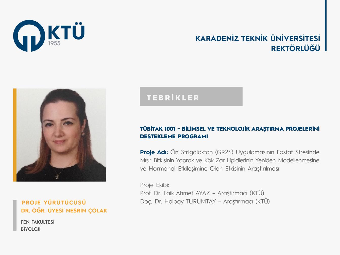 Üniversitemiz Fen Fakültesi Biyoloji Bölümü öğretim üyesi Dr. Öğr. Üyesi Nesrin ÇOLAK’ın "Ön Strigolakton (GR24) Uygulamasının Fosfat Stresinde Mısır Bitkisinin Yaprak ve Kök Zar Lipidlerinin Yeniden Modellenmesine ve Hormonal Etkileşimine Olan Etkisinin Araştırılması" başlıklı projesi “TÜBİTAK 1001 - Bilimsel ve Teknolojik Araştırma Projelerini Destekleme Programı” kapsamında desteklenmiştir.