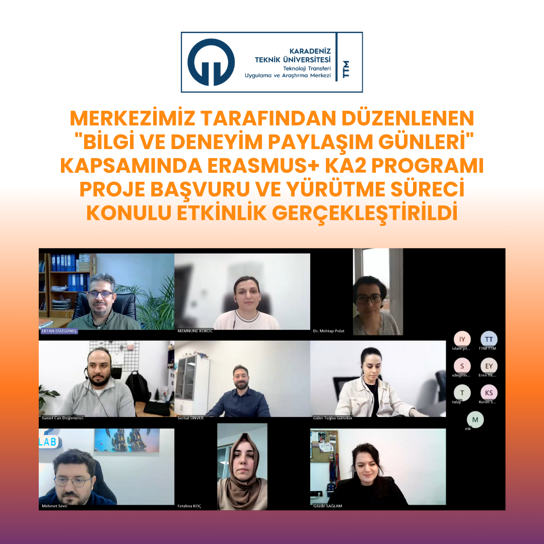 KTÜ Peyzaj Mimarlığı Bölümü öğretim üyesi Prof. Dr. Ertan DÜZGÜNEŞ ile KTÜ Öğretme ve Öğrenme Merkezi Koordinatörü Öğr. Gör. Dr. Memnune KOKOÇ konuşmacı olarak yer aldığı ve Moderatörlüğünü Merkezimizden Öğr. Gör. M. Serhat ÜNVER'in yaptığı etkinlikte katılımcılar, Erasmus+ KA2 Programı kapsamında proje hazırlama, başvuru ve proje yürütme süreçlerine ilişkin uygulamaya dayalı bilgi ve deneyimleri edinme fırsatı buldu.