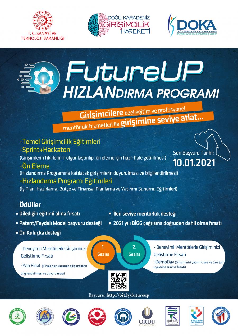 KTÜ Teknoloji Transferi Uygulama ve Araştırma Merkezi, Doğu Karadeniz Kalkınma Ajansı (DOKA), Doğu Karadeniz Bölgesi Üniversiteleri ve Teknokentleri işbirliğinde Artvin, Giresun, Gümüşhane, Ordu, Rize ve Trabzon'da teknoloji odaklı iş fikri olan, fikirlerini olgunlaştırmış veya prototiplerini tamamlamış girişimcilere yönelik "Future UP Hızlandırma Programı" na başvurular 10 Ocak'a kadar uzatıldı!