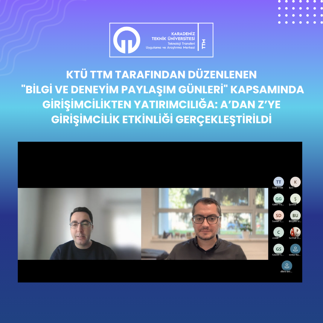 KTÜ Teknoloji Transferi Uygulama ve Araştırma Merkezi tarafından düzenlenen Bilgi ve Deneyim Paylaşım Günleri etkinlik serisi kapsamında, 3 Ekim 2025 Cuma günü saat 14.30’da çevrim içi olarak “Girişimcilikten Yatırımcılığa: A’dan Z’ye Girişimcilik Bilgi ve Deneyim Paylaşımı” başlıklı oturum gerçekleştirildi.