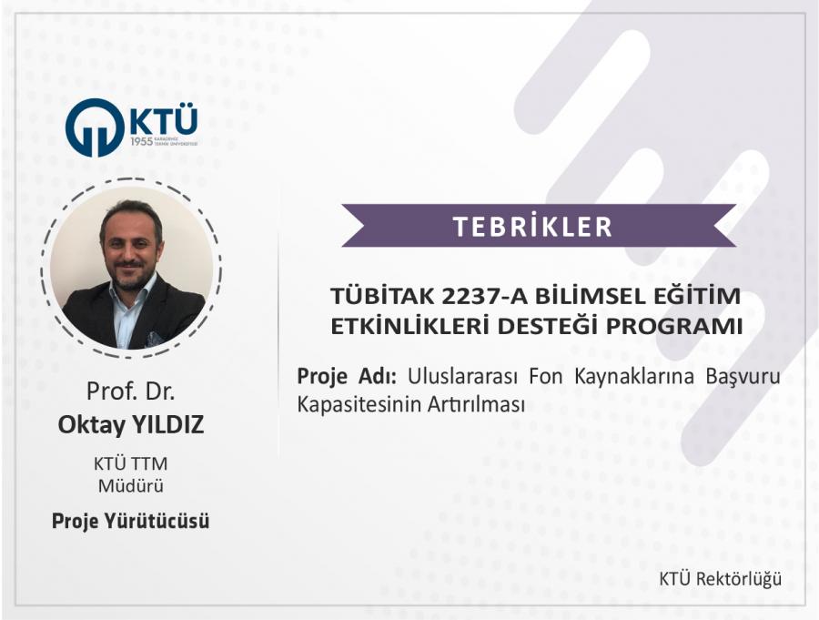 Üniversitemiz Teknoloji Transferi Uygulama ve Araştırma Merkezi (KTÜ TTM) Müdürü Prof. Dr. Oktay YILDIZ’ın "Uluslararası Fon Kaynaklarına Başvuru Kapasitesinin Artırılması" başlıklı projesi “TÜBİTAK 2237-A Bilimsel Eğitim Etkinlikleri Desteği” Programı kapsamında desteklenmiştir.