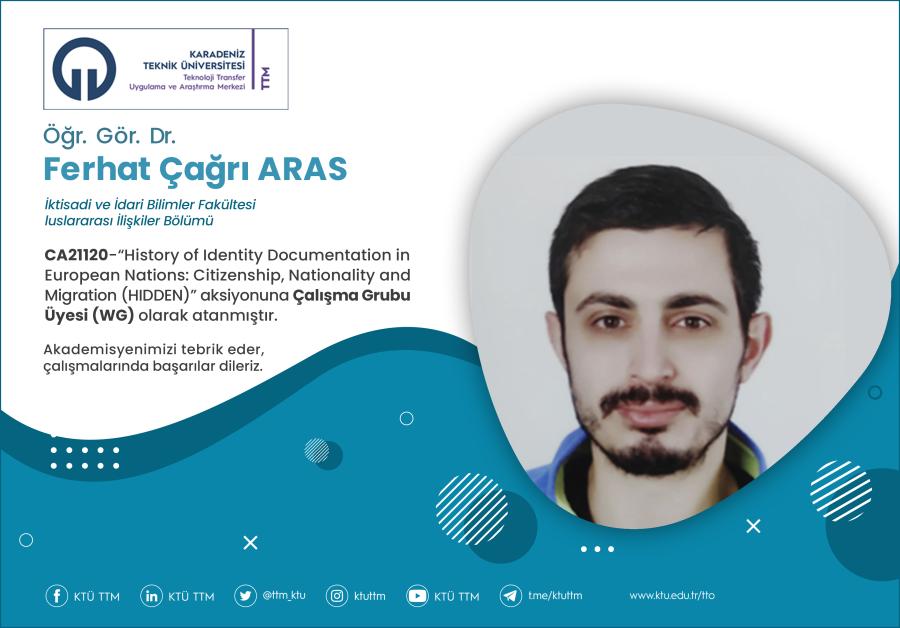 Üniversitemiz İktisadi ve İdari Bilimler Fakültesi Uluslararası İlişkiler Bölümü öğretim elemanı Öğr. Gör. Dr. Ferhat Çağrı ARAS, COST Programı’nın “CA21120 - History of Identity Documentation in European Nations: Citizenship, Nationality and Migration (HIDDEN)” aksiyonuna Çalışma Grubu Üyesi (WG) olarak atanmıştır.