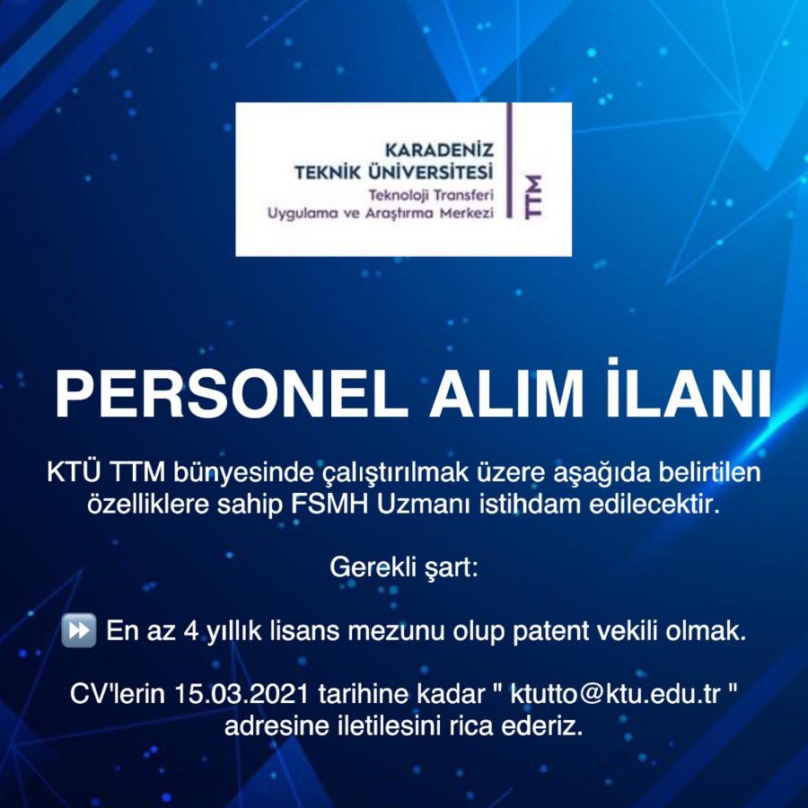 KTÜ TTM bünyesinde çalıştırılmak üzere aşağıda belirtilen özelliklere sahip FSMH Uzmanı istihdam edilecektir.