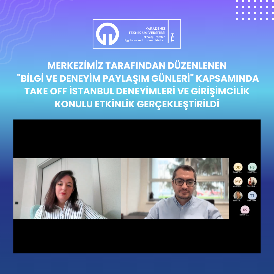 Merkezimiz tarafından düzenlenen Bilgi ve Deneyim Paylaşım Günleri etkinlik serisi kapsamında, bu hafta “Take Off İstanbul Deneyimleri ve Girişimcilik Bilgi ve Deneyim Paylaşımı” başlıklı deneyim paylaşımı etkinliği gerçekleştirildi.