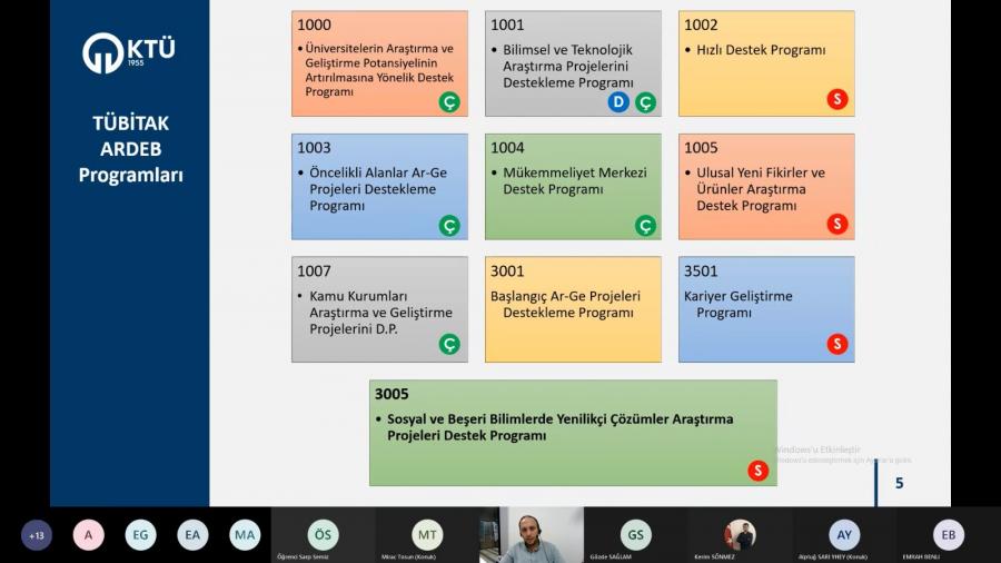 KTÜ TTM organizasyonuyla; TÜBİTAK ARDEB 3005-Sosyal ve Beşeri Bilimlerde Yenilikçi Çözümler Araştırma Projeleri Destek Programını tanıtmak, araştırmacılarımızın sorularını yanıtlamak ve ihtiyaç duydukları destek türlerine dair görüş alışverişinde bulunmak amacıyla 29 Eylül 2021 Çarşamba Günü Saat: 14.00’da Üniversitemiz araştırmacılarına yönelik bilgilendirme sunumu gerçekleşti.