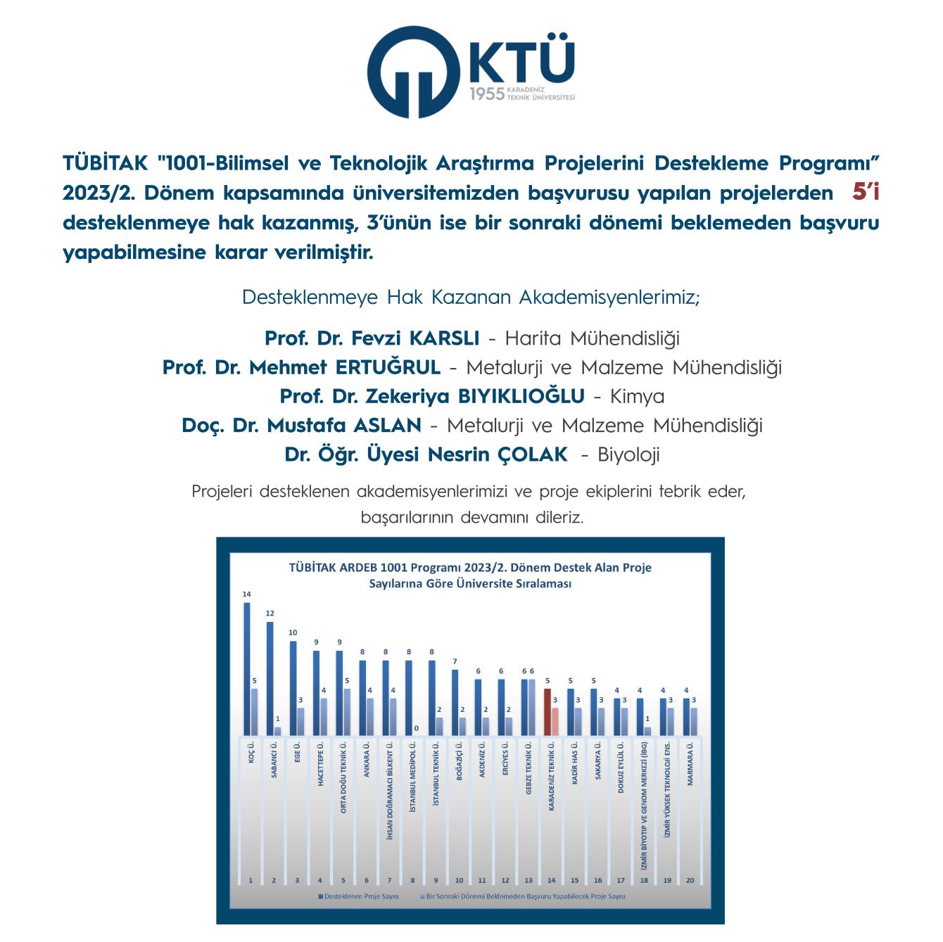 Üniversitemizden 24 proje başvurusunda bulunulmuş ve desteklenmeye hak kazanan 5 projeyle KTÜ; projeleri desteklenen üniversiteler arasında 14. sırada yer almıştır. Üniversitemizden başvurusu yapılan 3 proje önerisinin ise bir sonraki dönemi beklemeden başvuru yapılabilmesine karar verilmiştir.