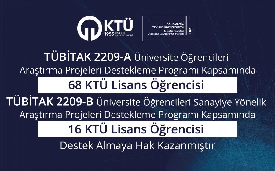 TÜBİTAK 2209/A Programı 2021/2. dönem kapsamında, 87 KTÜ Lisans öğrencisi başvuru yapmış ve bu başvurulardan 68 öğrencimizin projesi destek almaya hak kazanmıştır. Üniversitemiz, desteklenen proje sayısına göre 183 üniversite içerisinde 14. sırada yer almıştır. Bu program kapsamında Üniversitemizin destek oranı %78,2 olmuştur.