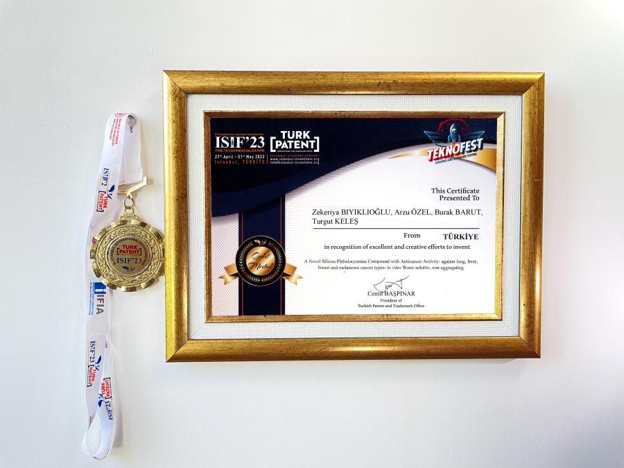 “A Novel Silicon Phthalocyanine Compound with Anticancer Activity: Against Ling, Liver, Breast and Melanoma Cancer Types: In Vitro Water Soluable, Non-Aggregating (Antikanser Etkili Yeni Bir Silikon Ftalosiyanin Bileşiği: Akciğer, Karaciğer, Meme ve Melanom Kanseri Türlerine Karşı Bileşik: In Vitro Suda Çözünür, Agregasyon Göstermeyen” adlı patenti ile Prof. Dr. Zekeriya BIYIKLIOĞLU, Doç. Dr. Arzu ÖZEL, Doç.Dr. Burak BARUT, Öğr. Gör. Turgut KELEŞ,