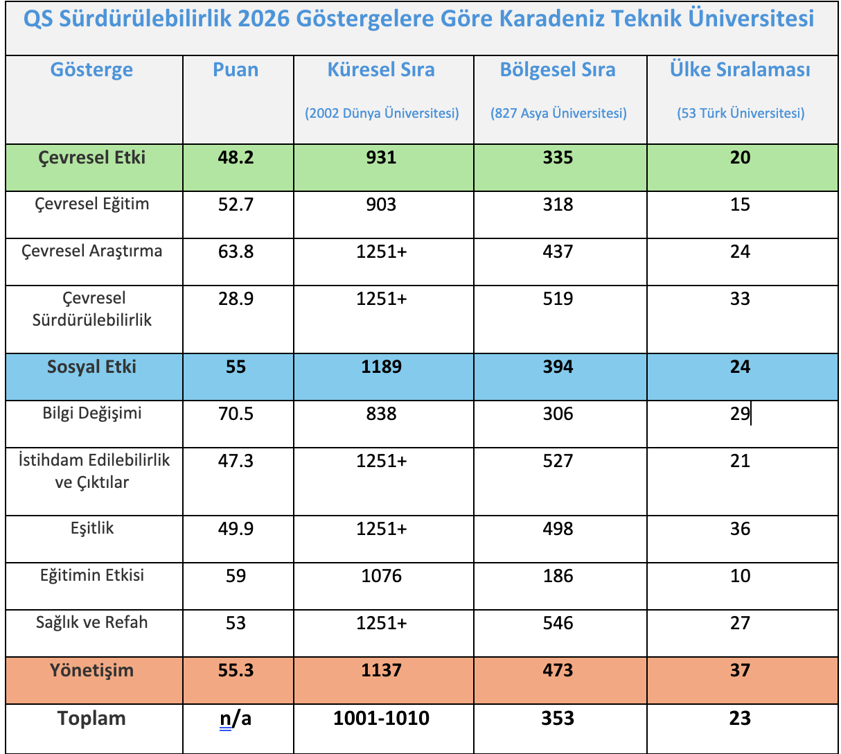 Karadeniz Teknik Üniversitesi (KTÜ), QS tarafından yayımlanan 2026 Sustainability Rankings sonuçlarında geçtiğimiz yıla kıyasla dikkat çekici bir başarı elde etmiştir. 2024 yılında dünya genelinde 1450’li sıralarda yer alan üniversitemiz, bu yıl yaklaşık beş yüz basamaklık bir yükselişle kendisini 1000’li sıralama bandına taşımayı başarmıştır. Geçtiğimiz sene Türkiye genelinde 29.sırada olan KTÜ bu yıl 23. sıraya yerleşerek ulusal ölçekte de konumunu güçlendirmiştir.
