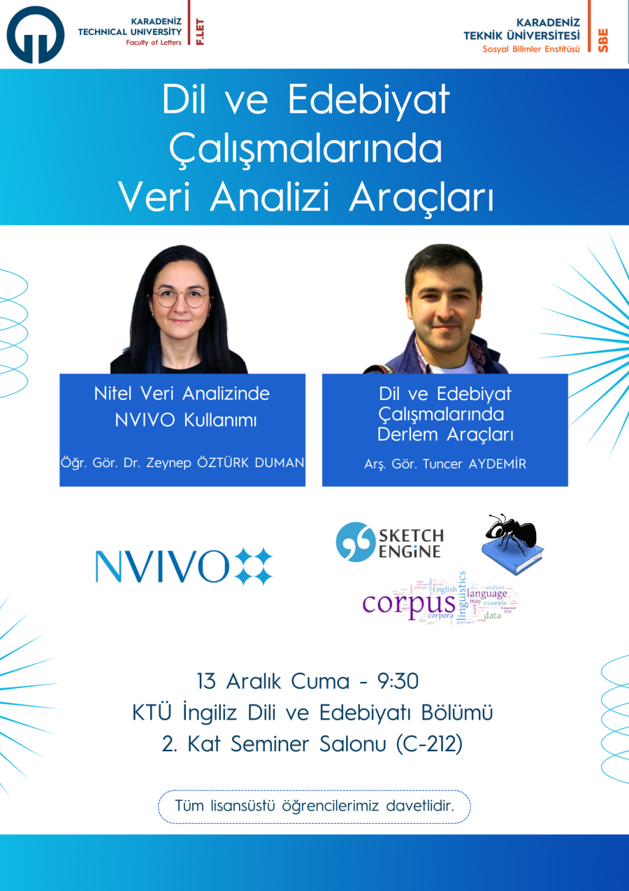 On 13 December 2024, our faculty members, Lect. Dr. Zeynep Öztürk Duman and Res. Asst. Tuncer Aydemir, delivered a seminar titled 'Data Analysis Tools in Language and Literature Studies'. During the course of the seminar, Dumandelivered a presentation on NVIVO, while Aydemir spoke on the subject of corpus applications.