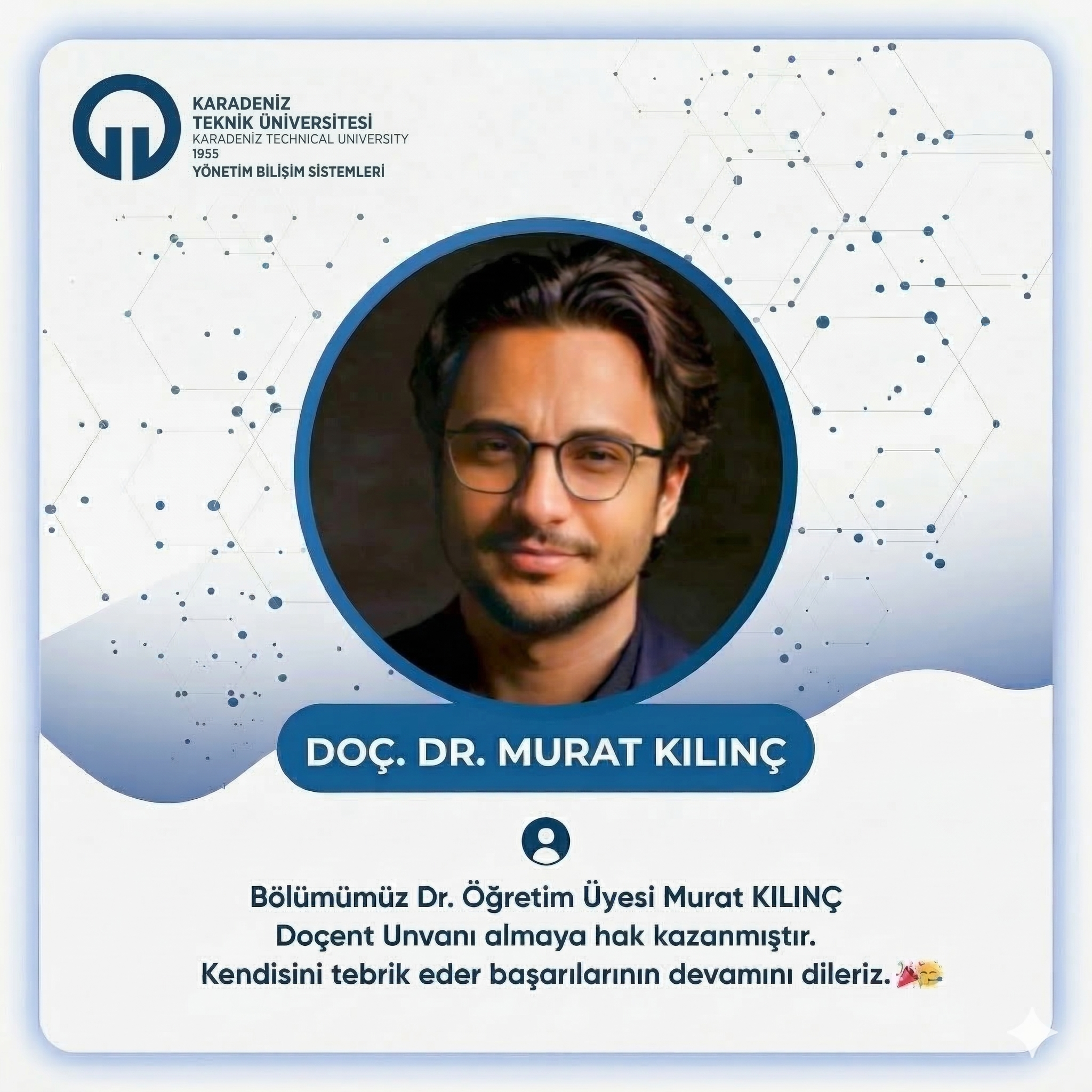 Bölümümüz Dr. Öğretim Üyesi Murat KILINÇ, Doçent Unvanı almaya hak kazanmıştır.